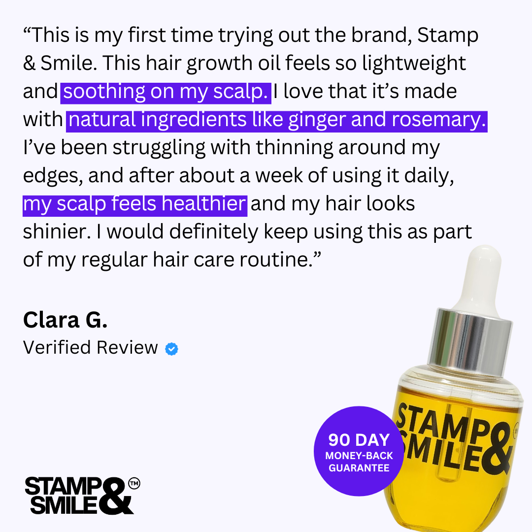 Our oil is designed to work hand-in-hand with the Stamp & Smile™ 3-in-1 Therapy Brush, which dispenses the serum directly into the scalp for 2× absorption and faster results.